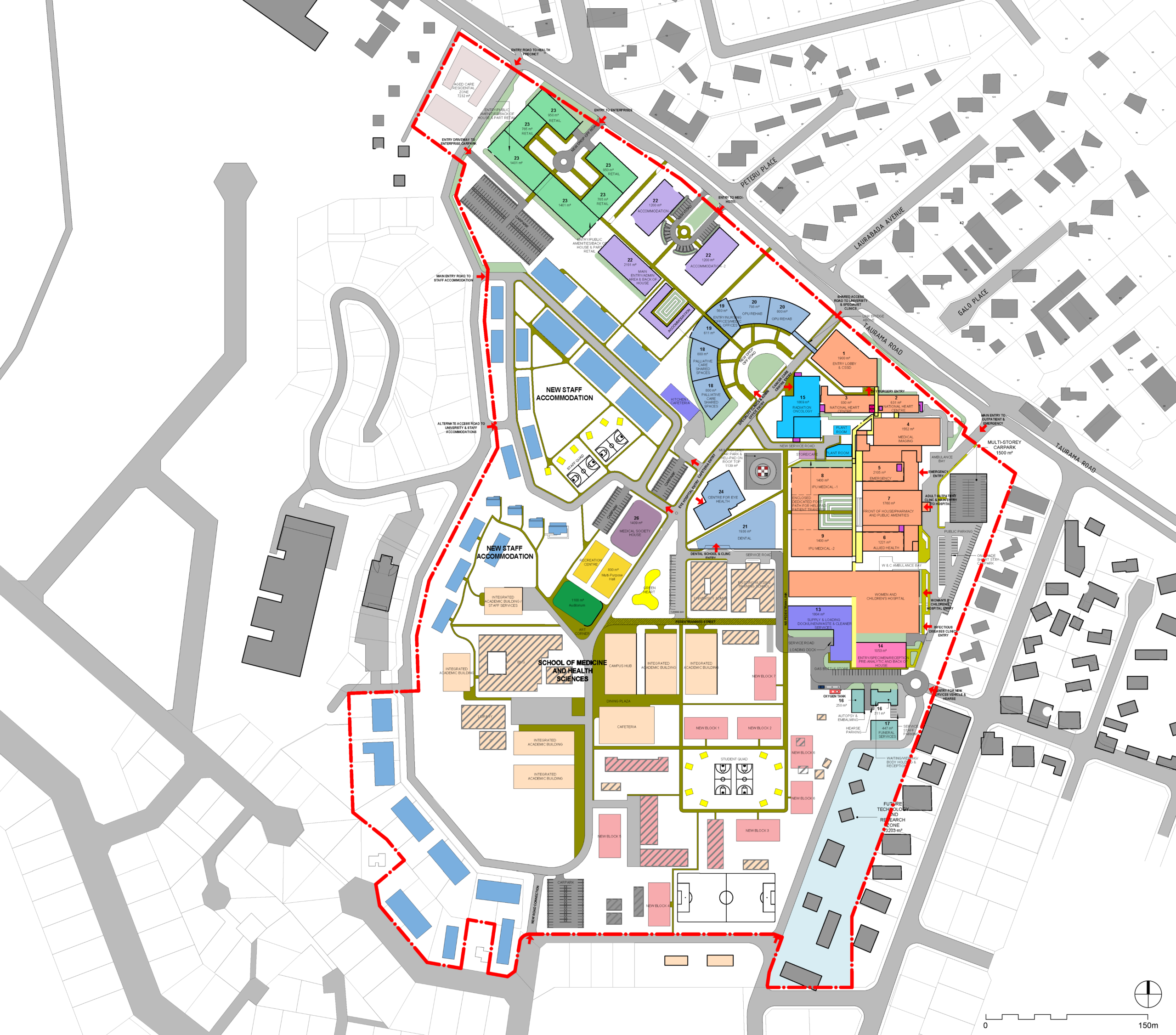 The proposed master plan outlines an integrated campus that combines teaching, clinical, and research facilities. Future development enables collaboration between health practitioners, students, and academic staff, while strengthening the University’s capacity to serve the Port Moresby community. The master plan also includes on‑campus student and staff accommodation, as well as recreational and wellbeing facilities to support campus life.